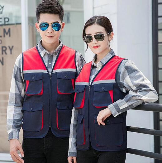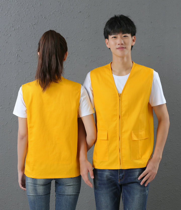 V领工装马甲,采用纯棉马甲,简约纯色版型,6色可选,前后均可印字,加反光条,现货供应。